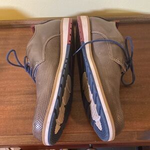 Stylish brown leather shoes. Perforated design. Blue laces. Comfortable and versatile.
