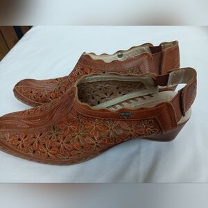 PIKOLINOS Romana Shoes Brown Leather Floral Heels Ankle Booties Vintage-(#120)