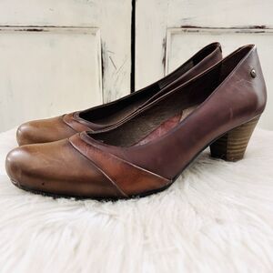Chic two-tone brown leather heels. Sleek design with a comfortable fit. Ideal for versatile wear. These are 6.5 or EU 37. I didn’t pay attention when I bought them so they’re 1/2 size too big for me.