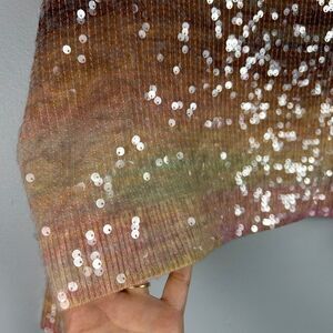 The sweater features a cozy mock neck and a relaxed, slightly boxy fit that offers a contemporary, comfortable silhouette. The gorgeous base color is a subtle multi-color tie-dye or ombre blend of earthy and soft hues, including shades of pink, mauve, taupe, brown, gold, olive, and blush, providing a unique and artistic backdrop for the sparkling sequin embellishments. The shorter, cropped-like length pairs perfectly with high-waisted skirts, trousers, or jeans for a chic, modern look. This is the ultimate blend of comfort and glamour—a true luxury knitwear piece!