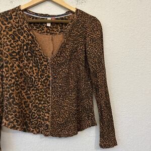 PILCRO ANTHROPOLOGIE Leopard Print Top Womens Sz XS Brown Waffle Knit Split-Neck W11723