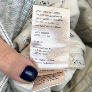 Zip fly, button closure, five pocket style, slim-boyfriend cut. Super light blue wash cotton denim with a hint of stretch. Distressing / destroyed on the legs.