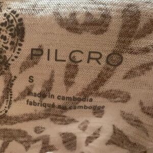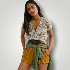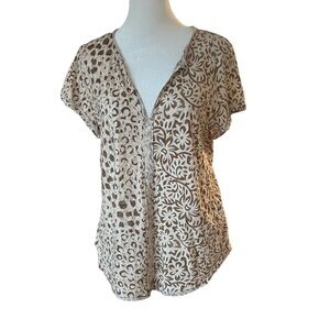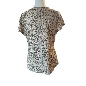 Anthropologie Pilcro and the Letterpress Split-neck tee. In a neutral motif with a off-white ivory; brown animal print & floral print. Short sleeves; exposed sleeves; splice V-Neck; pullover.