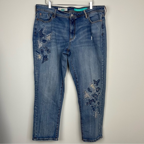Embroidered slim boyfriend jeans by Pilcro and The Letterpress from Anthropologie. Size 16W. Pre-owned, some very light signs of wear as shown in photos - overall excellent condition. 99% Cotton / 1% Elastane.