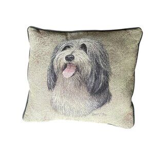 Wonderful Bearded Collie cushion signed by Robert May. No stains, holes or tears. Black piping edges the 14” x 16” pillow with all stitching intact. There are no tags attached.