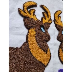 Set of 2 handmade pillow covers. Each cover has two reindeer standing over some flowers. These are handmade and I believe are done in Crewel stitching. It looks a little like a hook style stitch, but the backside appears to lean more toward Crewel stitching and there is no netting like you would see in a hook style. The design is about an 1/8" wide from the backing. They are identical and are done very nicely. They measure about 26" wide and 16" high. The end is open fold, without any snaps or other closers, to insert a pillow.