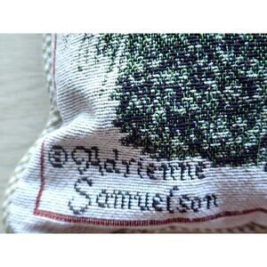 Nice tapestry design throw pillow featuring a black & white cat playing with a butterfly. The cat is sitting next a watering can and a bee hive with little bees flying around. There are lilac sprouts and garden gloves. It is a tapestry front and the back is a green & white small check material. There are no openings. The inside pillow feels like a foam pillow. It is signed "Adrienne Samuelson". It measures 12"x12".