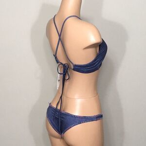 PILYQ Cayman Embroidered Gypsy halter bikini The fabric looks like Jean material. I love the embroidery on the front. It’s so nice and well done. The top has soft removable pads on the inside. It is labeled a D. It will fit a C to a size DD bra top. Adjusts in the back with ties for a fitted look. The bottoms are cheeky cut. Fully lined. This is so nice! You could even wear the top with other things. The bottoms are reversible to pink. Mine are like the ones on the manikin