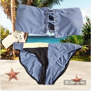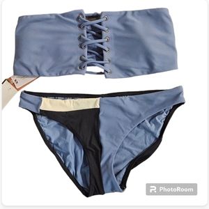 PILYQ Woman's Bikini Blue Lace Up Bandeau Top & Color Block Bottom Swimsuit Set