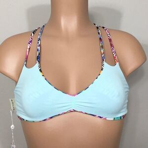 Versatile suit where the top could be worn as a sports bra or yoga top. The bottoms could match multiple prints in your wardrobe. Multicolored utopia halter top that reverses from a beautiful print to a solid mint green. Multi straps crisscross on the back. Pull over styling. I love it! The bottoms are reversible from berry pink to a baby blue. Teeny cut. Ruched partway down on one side with a gold emblem.