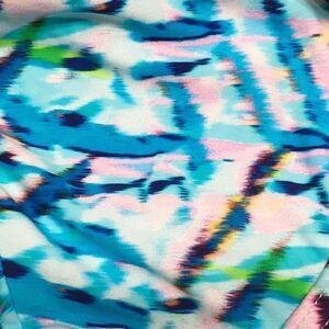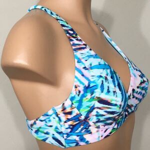 PILYQ tropical palm underwire Palmas bikini. Top is multicolored blue, pink, with hints of green and gold. It has adjustable crisscrossing straps in the back. Easy to fit multiple sizes.