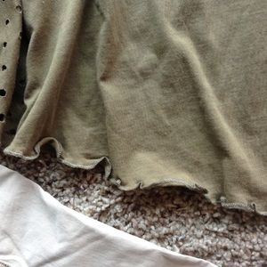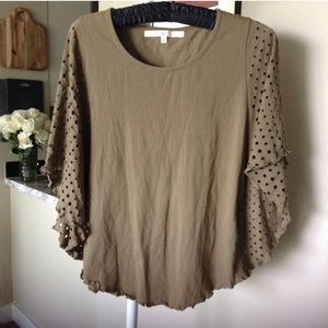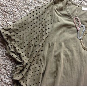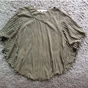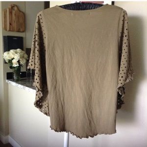 Such a pretty and unusual top by an interesting indie label based and designed in NYC and produced by artisans in Peru. No fabric tag but feels like premium quality, long staple Pima cotton. Laser-cut decorative polka dot holes on the flutter sleeves and a delightful ruffled hem. A saturated shade of olive green. 23" long and 34" across the bust unstretched. Cute and flattering! I am just a little tall for it (I am 5'11).