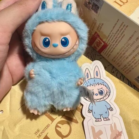 It’s a tiny, fluffy collectible with soft grey fur, iconic bunny ears, and Labubu’s signature mischievous grin.