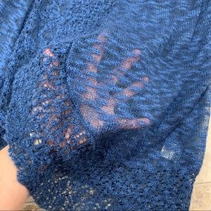 PINA ROSSI blue open front cardigan | semi sheer | scalloped edge | 3/4 length sleeves | 73% acrylic, 27% polyester | size S | length from shoulder to bottom hem is 30” | inseam is 19”