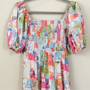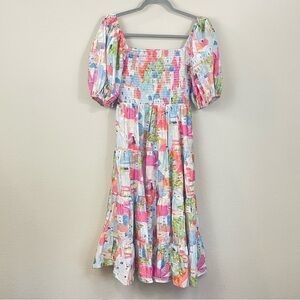 PINCH Jetset Motif Smocked Puff Sleeve Midi Dress Size Large