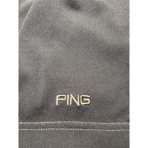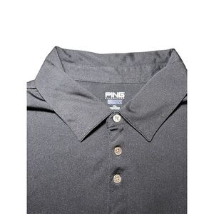 Keywords: PING polo, men's golf shirt, black polo, short sleeve, collared shirt, embroidered logo, activewear, button-up front, spread collar, machine washable, pre-owned, XL size, regular fit, polyester polo, golf apparel.