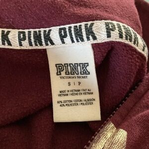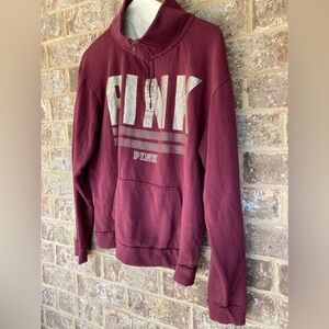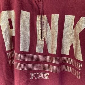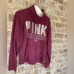 Pink 1/4 zip sweatshirt in a burgundy. Gently preowned condition. Armpit to armpit measures 18”.Shoulder to hemline measures 22”. 60 cotton 40% . Machine wash cold.