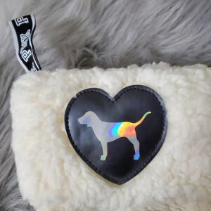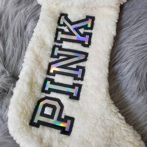 PINK by Victoria's Secret 2017 collectable white sherpa fluffy Christmas stocking with iridescent / holographic lettering White teddy soft Christmas stocking with black heart and black lettering, centered by iridescent dog and lettering. Perfect for the collector who is missing this piece or any lover of PINK. Excellent condition, never been used.