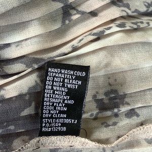 Women’s long-sleeved blouse with a pleated design and a pink and black marble-like pattern, relaxed fit, boat neck, and a pleated section at the yoke and a flowing, sheer fabric