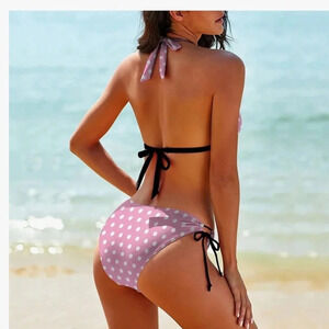 Discover a playful twist on a classic favorite with this pink polka dot triangle string bikini set. Designed for women who love a touch of whimsy, this set features seamless edges for a smooth, comfortable fit. The classic bikini cut offers just the right amount of coverage, making it perfect for lounging by the pool or catching some sun at the beach. Whether you're planning a tropical getaway or a weekend staycation, this vibrant swim bottom is sure to become your go-to choice. Available in size S, this item is brand new and ready to make a splash in your swimwear collection.