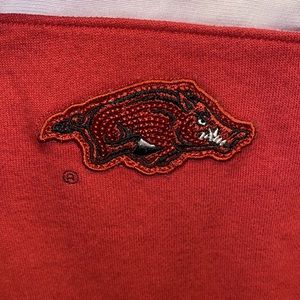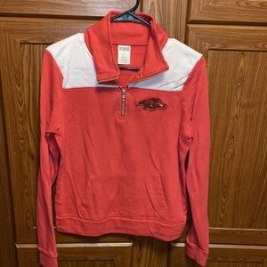PINK Victoria Secret Arkansas Razorbacks Hogs pullover with zipper at chest. Red and white. Red Sequin hog and Arkansas on back. Size xs