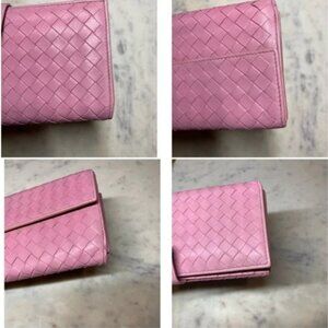 Authentic Bottega Veneta Intrecciato Snap Long Wallet in Pink. This gorgeous wallet features a pink leather interior with card slots, a billfold, and a convenient backside change compartment. While it is gently used with minor corner wear, it still exudes elegance. Measures 7.5β x 3.75β x 1β. Elevate your style with this stunning accessory!