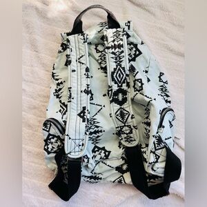 Light blue and black Aztec printed backpack. Cinch closure. 2 side zipper pockets and a front zipper pocket. Top has magnetized closure.