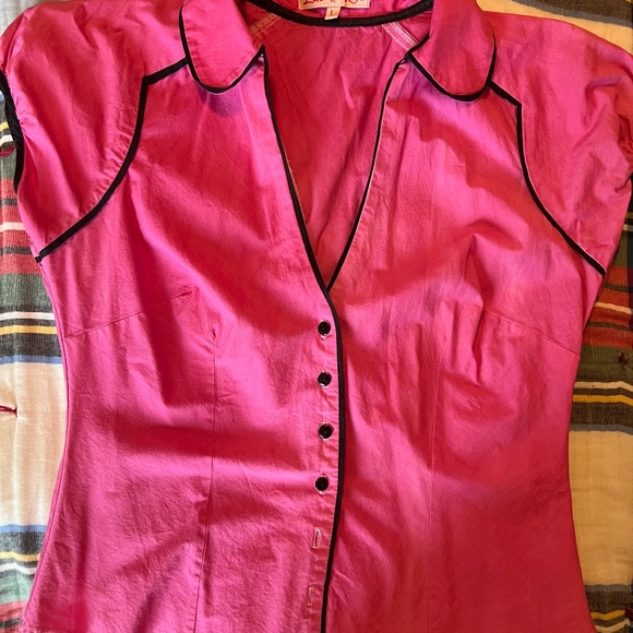 LILI ROSE, PINK BLOUSE WITH BLACK STRIPING AND BUTTONS. ALL COTTON, SOME SPOTS SLIGHTLY WASHED OUT BUT GOES WITH THIS CUTE PIECE.