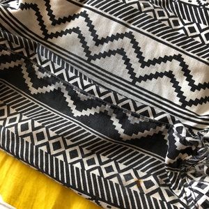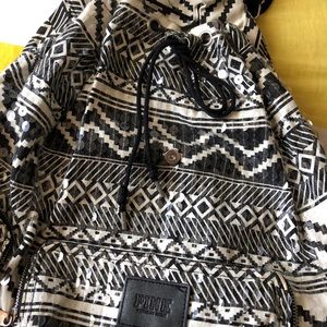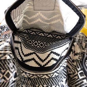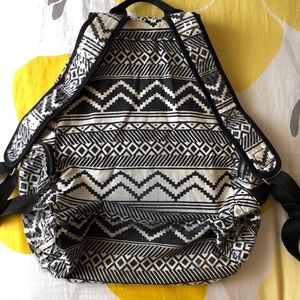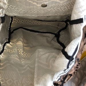 Black and white pattern with clear sequins. Has a magnetic closure that works like normal and then a drawstring top. One large pocket in front and two on the side that all zip up. The back bottom of the backpack is a bit dirty from use and I believe just denim staining bc I did use this backpack for school. There’s also an orange stain as pictured in the last pic.