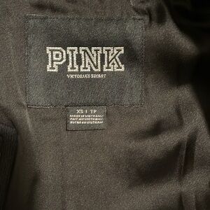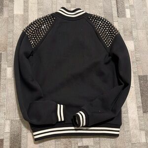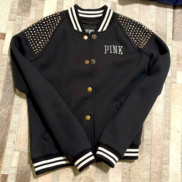 PINK Black Letterman Jacket w/Silver Nailheads. Jacket has white trim around bottom & end of end of sleeves. Snaps for closure. Fully lined. Excellent condition