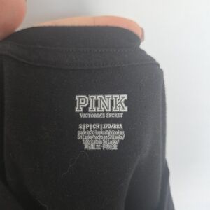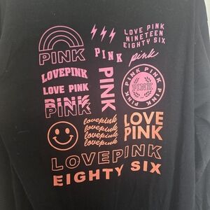 Stylish black long sleeve shirt featuring a pink logo on the chest and sleeve.