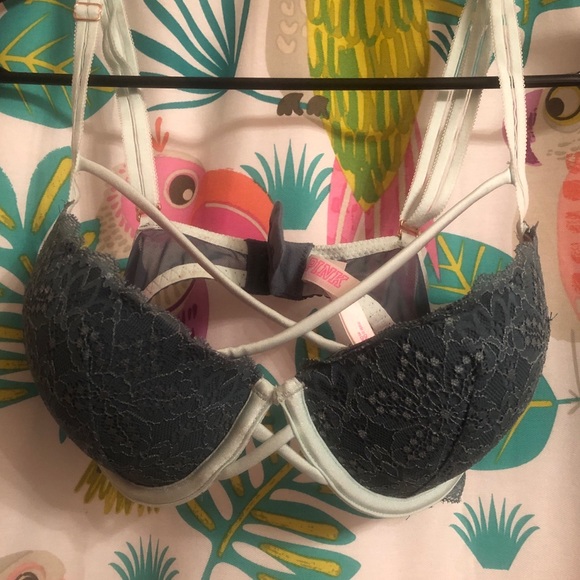 This bra is blue and super cute! It has a crisscross in the front and the back is sheer! Feel free to ask any questions! 32DD also would fit a 32D
