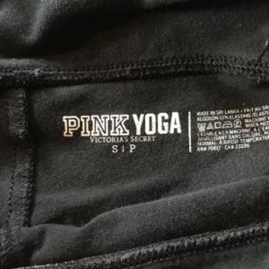 Black leggings with PINK logo, thick around the waist, with blue design on the side at the bottom. Good quality.