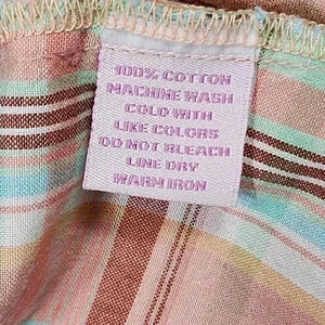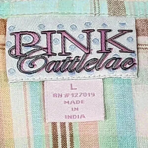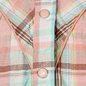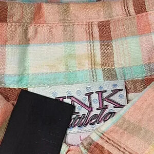 PINK Cattlelac Women's Western Short Sleeve Size L Peach/ Blue Plaid wit Peach Snaps Cowgirl Rodeo Style with Embroidery arrows on the upper chest area. Slim fittingGood condition. Small makeup smudge just above tag on inside collar. See photo.