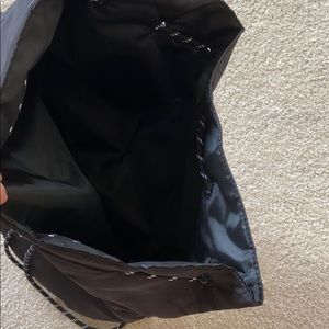 NWT black drawstring bag. The size is perfect for lots of items but small enough that it is easy to carry. The outside pockets are large and perfect for water bottles or anything else.