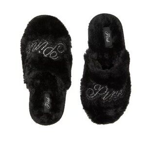 PINK Faux-Fur Closed-Toe Slippers Pure Black Bling Logo Size S