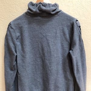 PINK gray sweatshirt w/ printed brand logo on torso and sleeves. This piece doesn't have a hood but has extra cloth and drawstring around neck (almost like a loose, adjustable turtleneck).