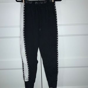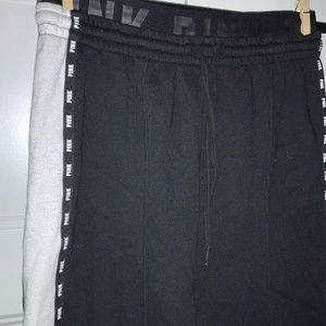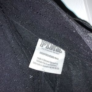 Very small staining on the back back it’s unnoticeable. PINK logon goes down the length of the pant as well as a white stripe down the leg. Drawstrings still in.