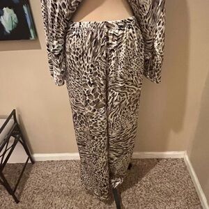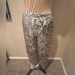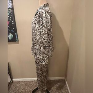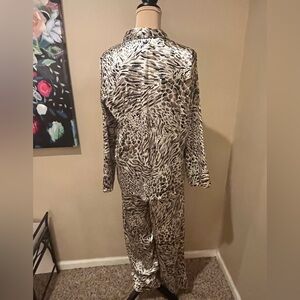 Chic animal print satin set. Includes button-up top and pants. Ideal for lounging.