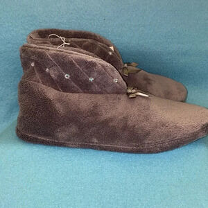 PINK K Claudia slipper booties fleece gray bows rhinestones comfy soft, quilted around ankle section, non skid rubber soles
