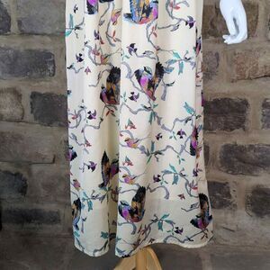 Features: Braided straps & trim, fully lined, birds on branches print, sweetheart neckline, cream colored with multi colored print