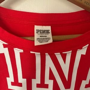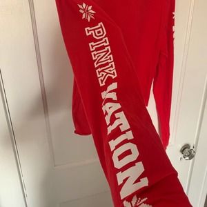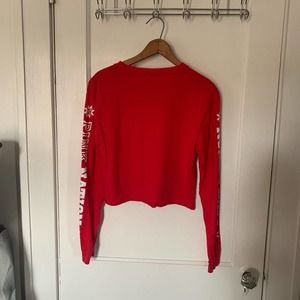 PINK Nation winter edition long sleeve crop tee, winter edition, in good used condition, has winter design on front and sleeves, red with white lettering, no pockets, size medium