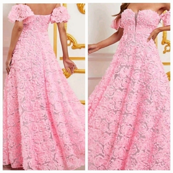 PINK PARTY PUFF SLEEVE OFF THE SHOULDER, FLORAL, MAXI DRESS WITH APPLIQUE FOR SPECIAL OCCASIONS