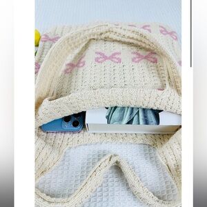 PINK RIBBON BOW PATTERN KNITTED WOVEN CROCHET TOTE BAG