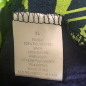 FRONT HAS BRIGHT GREEN & NAVY ABSTRACT PATTERN & BACK IS SOLID NAVY BLUE.