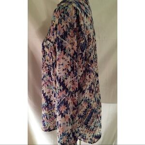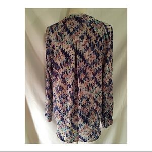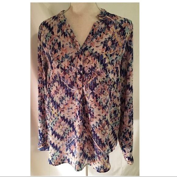 Comfortable pullover blouse with v-neck, 3 button at v, hi low length. Multi-colors: navy, green, pink, white. Long sleeves which can be buttoned up to half sleeves. All buttons intact. Upper left breast pocket.