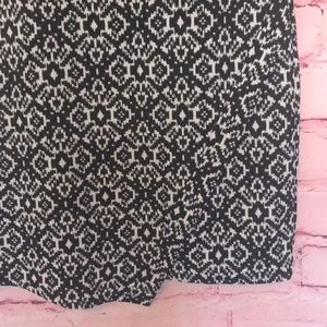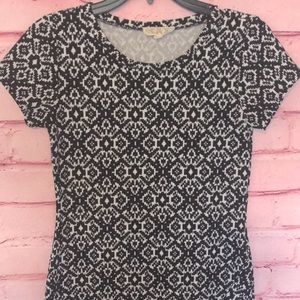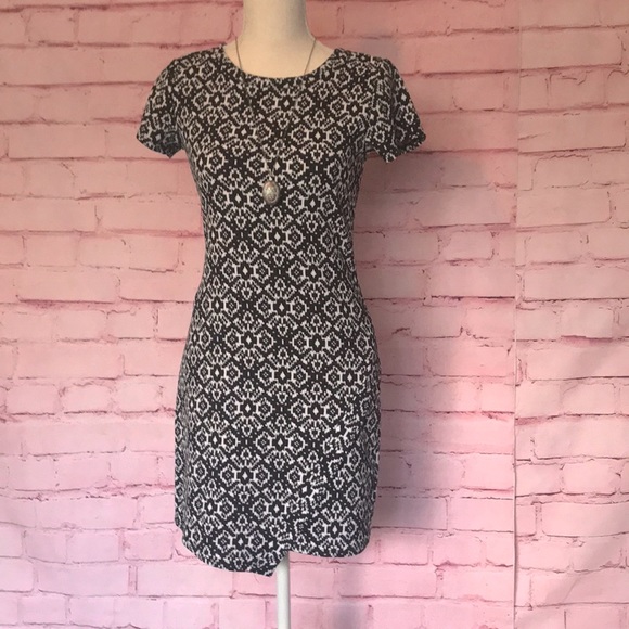 Black and white crewneck patterned dress by brand Pink Rose. Short sleeves. Above knee length. Size small. Fun diagonal crossover design that goes to bottom hem for modern style. Fitted. Cute as a dress or over leggings in cool weather. an extra big bonus about this dress is I’ve never noticed any wrinkles on it!