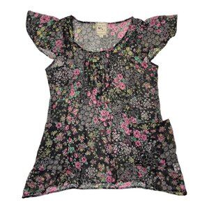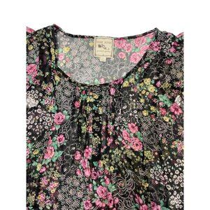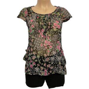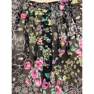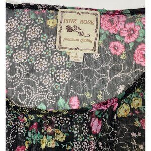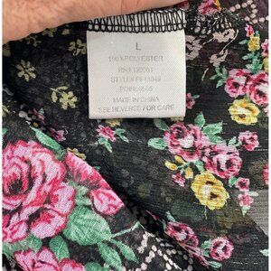 PINK ROSE Womens Sheer Boho Floral Top Large Black Multi Chiffon Slouch Pockets