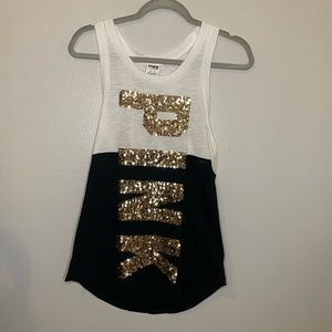 PINK Racerback Tank. Size XS but it’s oversized so it fits like a small for me. Great condition worn once, no missing sequins.