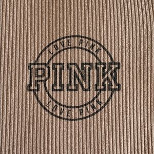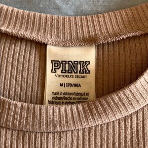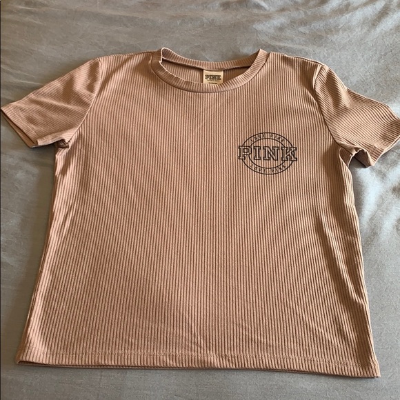 This PINK top is a beige/pink color with a ribbed design. It has a screen printed pink logo on the left side of the chest. Has some stretch and very comfortable. Clear my closet! Make an offer! Bin #4